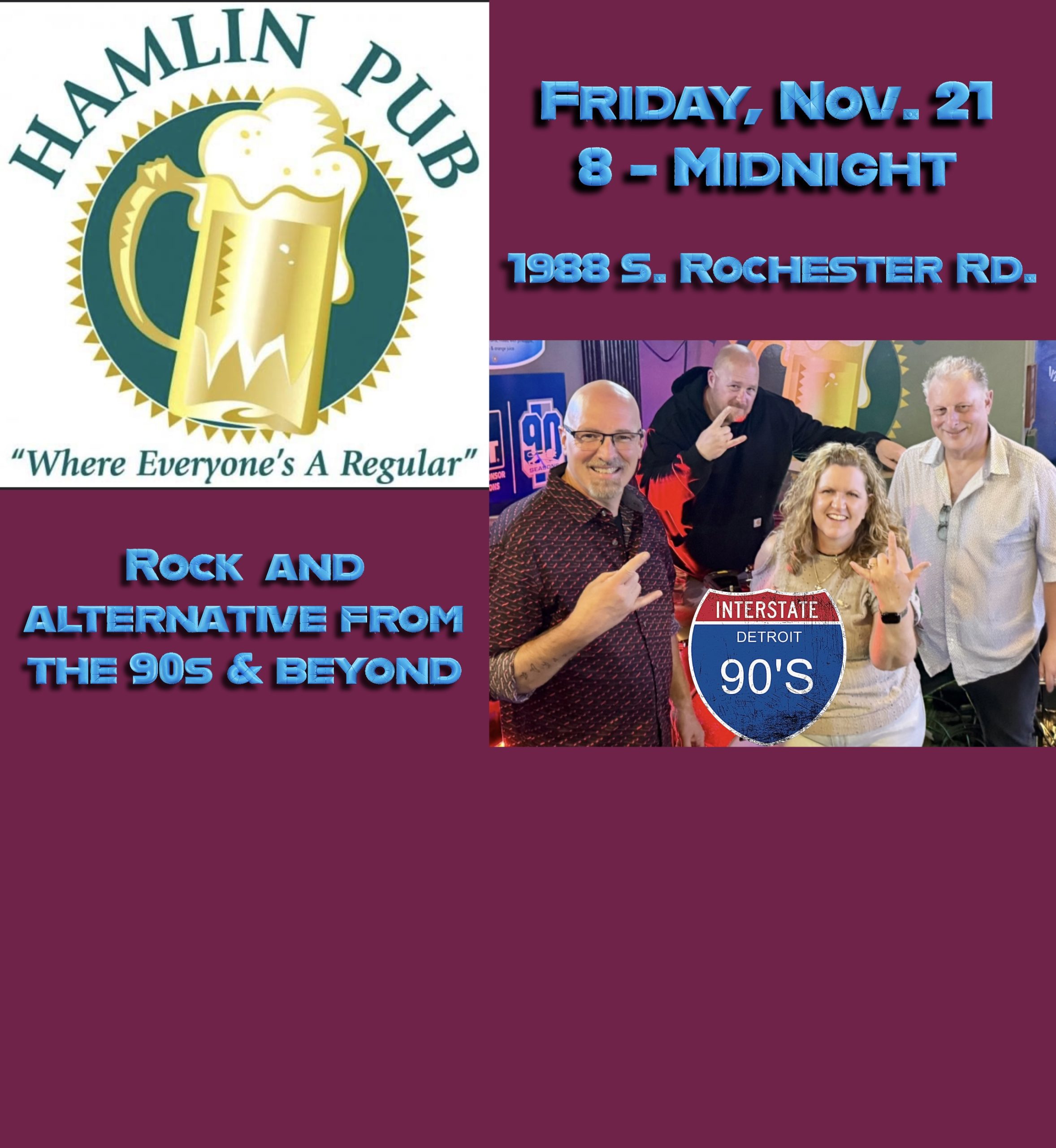 It’s the last weekend before the holiday season and Hamlin Pub (Rochester/Hamlin roads) is the place to be! Friday, November 21st we’re bringing even more of your favorite rock and alternative from the ‘90s and beyond for one awesome party. Enjoy awesome food and drink specials while we provide the soundtrack!